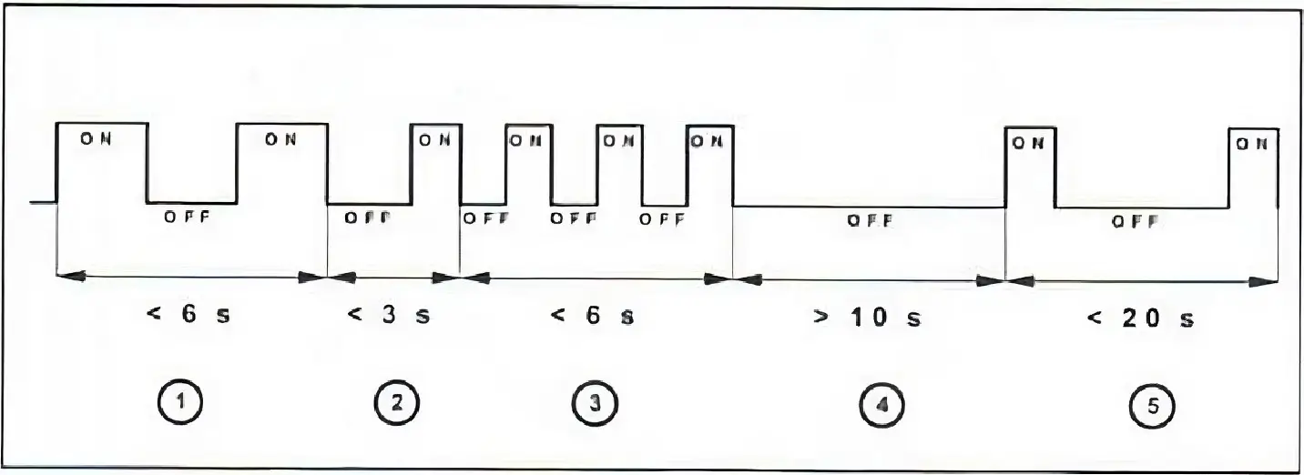 Switch the ignition ON and OFF twice within 6 seconds. Do not start the engine. Just turn the key to position 2 and back.